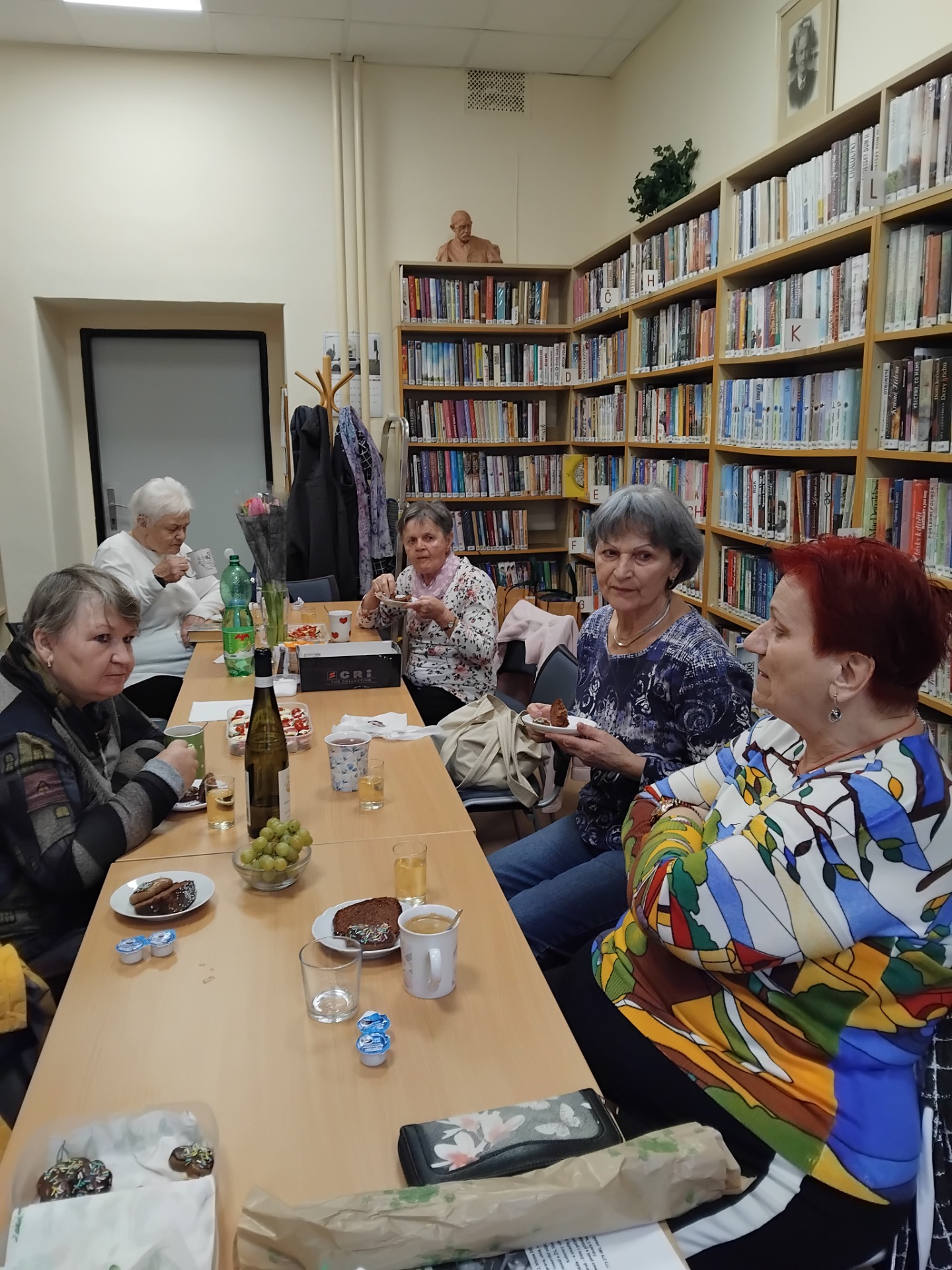 Na březnovém "babinci" se v knihovně sešlo 11 účastnic (+jeden vnouček). Pojaly jsme ho trochu jako oslavu MDŽ, nad kávou a přinesenými dobrotami jsme probraly knižní a jiné novinky, ani kytička nechyběla. Děkujeme MAS Achát za podporu těchto akcí komunitního setkávání.